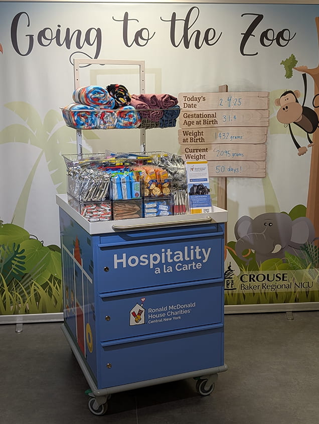 Stocked with assorted grab-and-go snacks and refreshments, children’s activities, and personal care items and toiletries, our Hospitality Cart travels through select hospital departments and affiliated clinics.